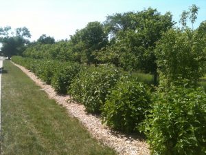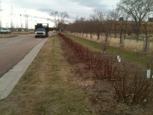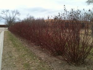 Shrub rejuvenation is not that difficult once you get the hang of it. For dogwoods, our end goal is twelve to twenty branches that are all roughly the size of your pinkie finger. When beginning this process, the first step is to remove any dead or really thick branches by cutting them as close to the ground as possible. Then we pick the height that we want by looking at the nodes, or the point on a plant where a branch, bud, or leaf develops. It is easiest to choose a middle branch node that is roughly the height you want and cut that branch first and work your way out from there. We want to make the cut as close to the top of the node as possible. The next step is to remove any low growing branches that don’t fit the shape of the plant. The final product will have a roughly round shape to it with all the branches being about the same size. A convenient thing that the City of Fargo does is pick up branches for free. If you leave a pile of branches on your boulevard, the City will come and pick them up on your designated garbage day.